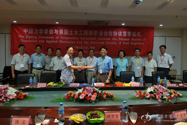 2010年8月21日~25日,国家自然科学基金委员会数理科学部环境力学夏季讲习班在河海大学举行。借助此次各位嘉宾和主讲教授来南京的机会,中国力学学会与美国土木工程师学会举行了合作协议签字仪式。代表中国力学学会出席签字仪式的是中国力学学会理事长李家春院士,美国土木工程师学会特别授权代表是密西西比大学工学院院长Alex Cheng教授。签字仪式由郑晓静院士主持。