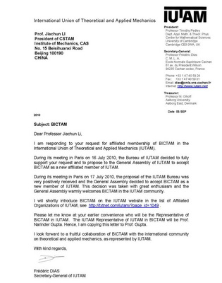 2010年7月中旬,国际理论与应用力学联合会(International Union of Theoretical and Applied Mechanics, 缩写为 IUTAM)全体理事大会如期在法国巴黎召开。此次全会上,由中国力学学会提交的关于北京国际力学中心(Beijing International Center for Theoretical and Applied Mechanics,缩写为BICTAM,简称为“中心”)成为IUTAM关联所属组织(Affiliated Organizations of IUTAM)的申请获IUTAM理事会批准,“中心”正式成为IUTAM关联所属组织。